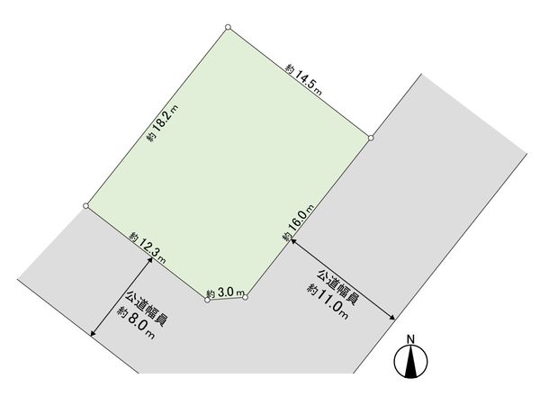| 接道状況 | 南東側: 約 11m (公道)、南西側: 約 8m (公道) |