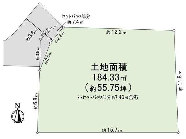 | 土地面積 | 184.33㎡(約55.75坪) ※セットバック約7.4㎡を含む ※別途私道約48.99㎡有 (共有持分 1/3) |