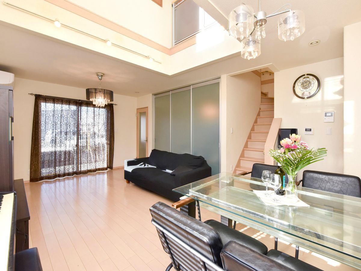 ●LDKは広々18.3帖、天井吹き抜けで開放感があります ●カウンターキッチン+勝手口付きで家事動線良好 ●洋室(主寝室)は約10帖でゆとりある空間です ●納戸にもクローゼット完備で収納充実 ●シューズインクローク有り ●普通車1台+軽自動車1台駐車可能(サイズ制限有)