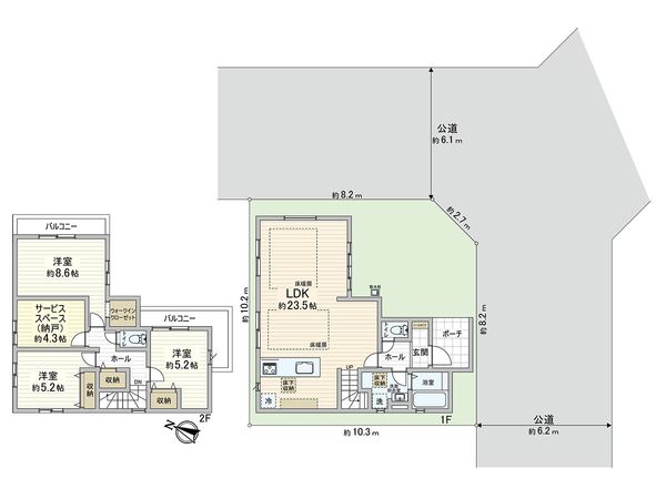 | 接道状況 | 南東側: 約 6.2m (公道)、北東側: 約 6.1m (公道) |