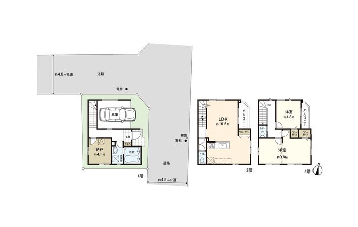 | 接道状況 | 東側: 約 4.5m (公道)、北側: 約 4m (私道) |