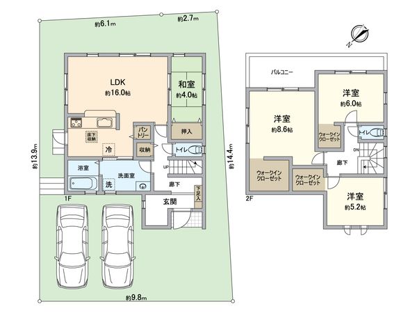 ○令和8年2月完成予定の新築戸建 ○4LDKの間取り ○約16.0帖の広々としたLDK ○洗面室にはキッチンと廊下から出入り可能な回遊性のある間取り ○ウォークインクローゼット3箇所有 ○トイレ2箇所(1階・2階) ○駐車スペース2台分有(車種による制限有) ○第一種低層住居専用地域につき閑静な住宅地 ○北西側前面道路幅員:約6.3m 間口:約9.8m