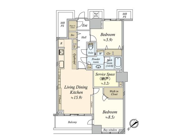 2LDK / 59㎡ / 2005年02月築 / 8階