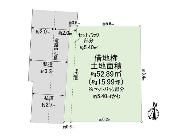| 土地面積 | 52.89㎡(約15.99坪) ※セットバック約5.4㎡を含む |