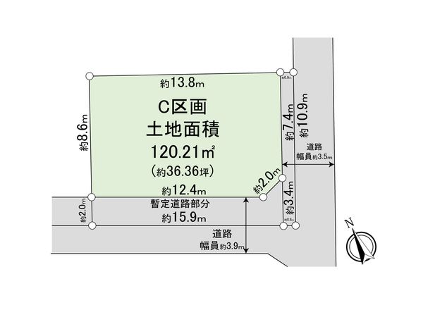 | 接道状況 | 南西側: 約 3.9m (私道)、南東側: 約 3.5m (私道) |