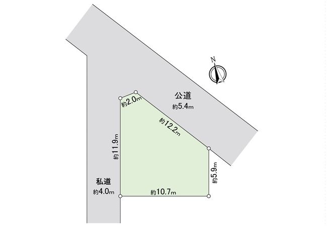 | 接道状況 | 北東側: 約 5.4m (公道)、北西側: 約 4m (私道) |