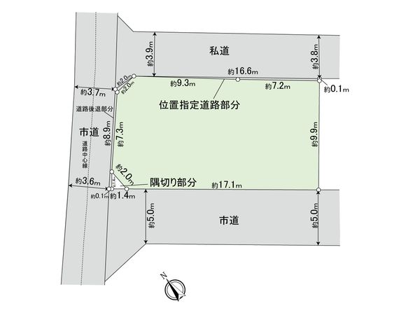 | 接道状況 | 南西側: 約 5m (公道)、北東側: 約 3.8m (私道)、北西側: 約 3.6m (公道) |
