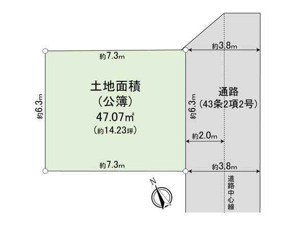 | 土地面積 | 47.07㎡(約14.23坪) ※別途私道約10.56㎡有 |