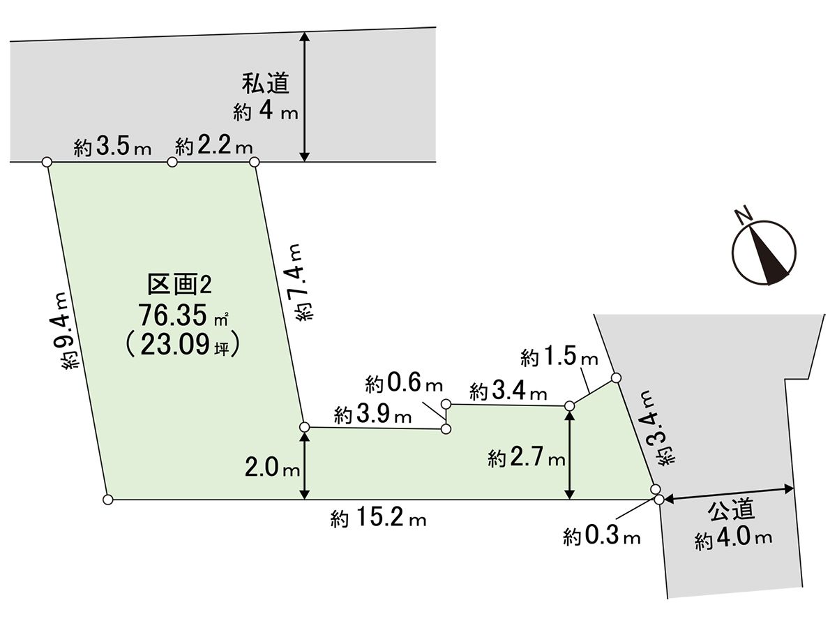 | 接道状況 | 南東側: 約 4m (公道)、北東側: 約 4m (私道) |