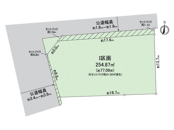 | 土地面積 | 254.87㎡(約77.09坪) ※セットバック約21.02㎡を含む ※別途私道約7.11㎡有 (共有持分 1/2) |