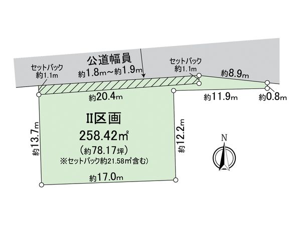 | 土地面積 | 258.42㎡(約78.17坪) ※セットバック約21.58㎡を含む ※別途私道約7.11㎡有 (共有持分 1/2) |