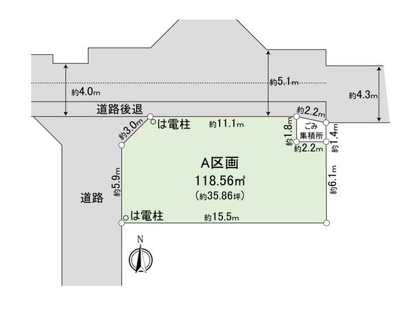 | 土地面積 | 118.56㎡(約35.86坪) ※セットバック約13.75㎡を含む |