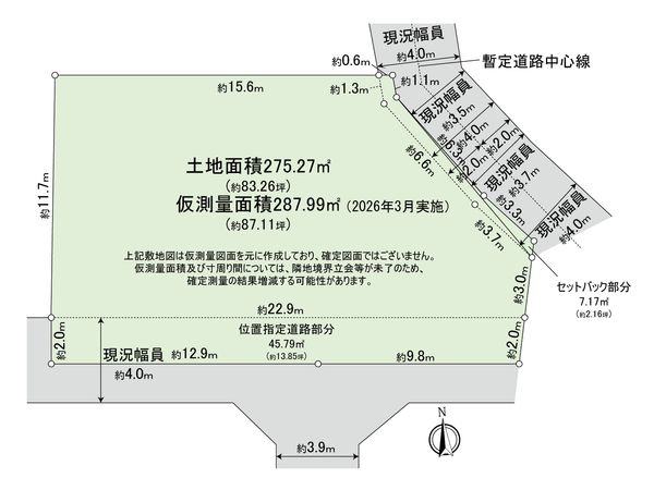 | 備考 | ・仮測量面積/約287.99平米(2026年3月実施) ・仮測量面積は、隣地境界立会等が未了のため、確定測量の結果増減する可能性があります |