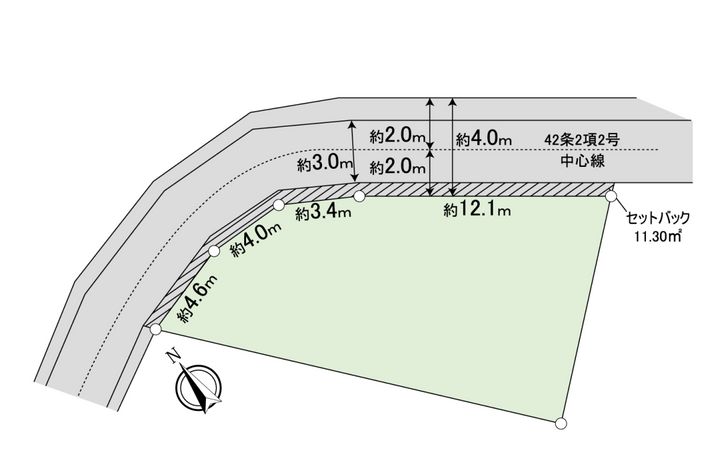 | 接道状況 | 北東側: 約 4m (公道)、北西側: 約 4m (公道) |