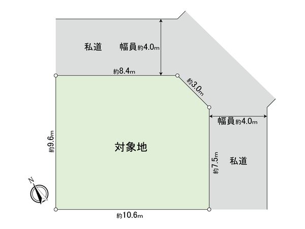 | 接道状況 | 北東側: 約 4m (私道)、南東側: 約 4m (私道) |