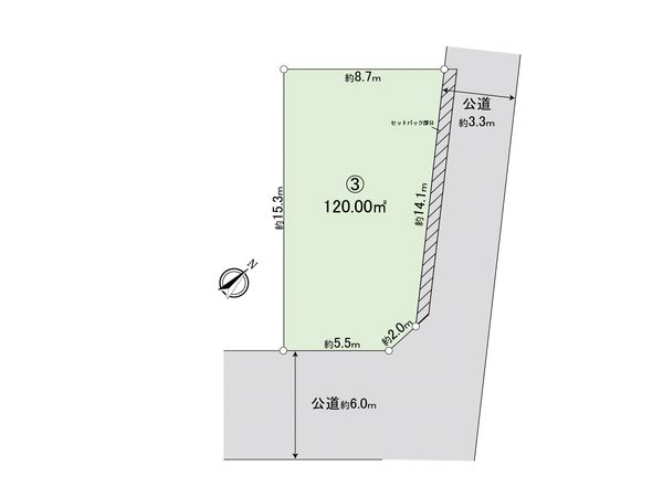 | 土地面積 | 120㎡(約36.3坪) ※セットバック約8.4㎡を含む |