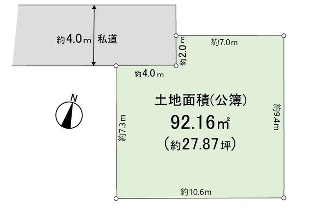| 土地面積 | 92.16㎡(約27.87坪) ※別途私道約10.44㎡有 |