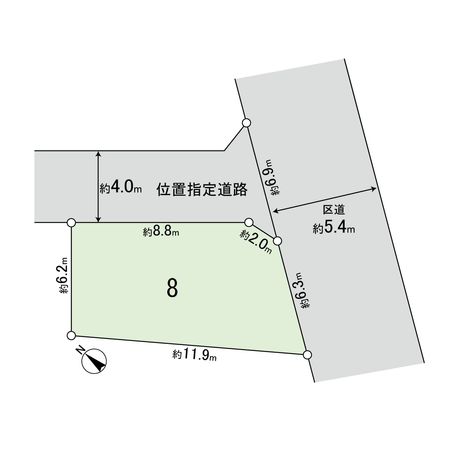 | 接道状況 | 南東側: 約 5.4m (公道)、北東側: 約 4m (私道) |