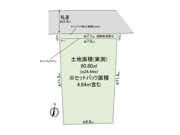 | 土地面積 | 80.8㎡(約24.44坪) ※セットバック約4.64㎡を含む ※別途私道約12.88㎡有 (共有持分 2/12) |