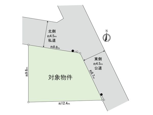 | 接道状況 | 北側: 約 4.5m (私道)、東側: 約 4m (公道) |