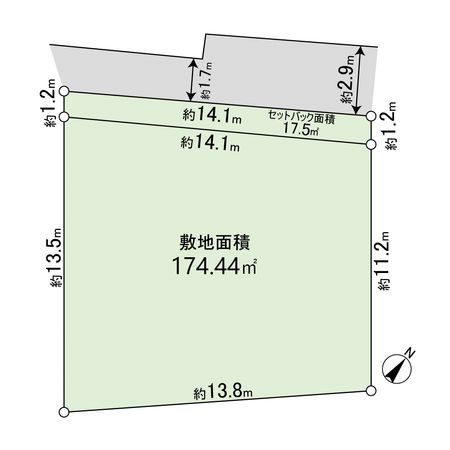 | 土地面積 | 174.44㎡(約52.76坪) ※セットバック約17.5㎡を含む |