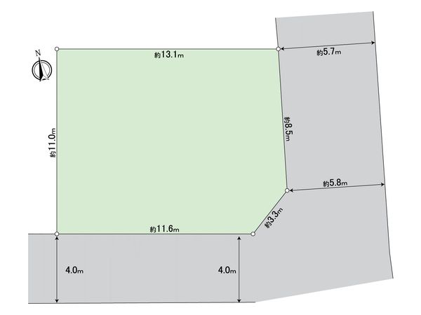 | 接道状況 | 南東側: 約 5.7m (公道)、南西側: 約 4m (公道) |