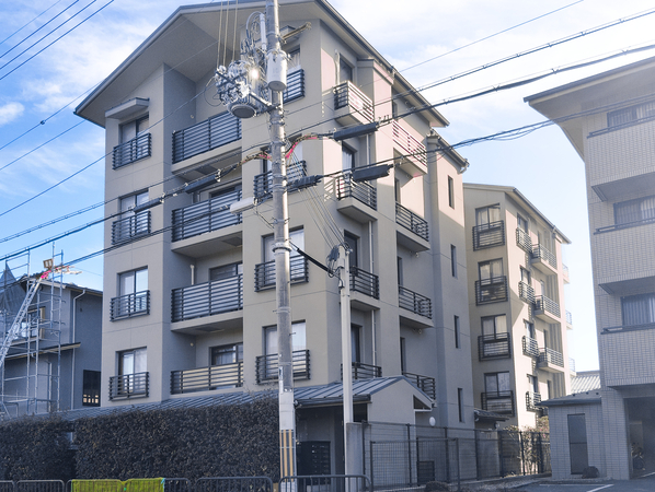 「シンフォニー宝ヶ池」は、左京区岩倉北池田町に位置します。最寄りの京都市営地下鉄烏丸線「国際会館」駅までは徒歩10分。歴史ある風致地区の景観に調和するよう、伝統的なじゅらく色を基調とした和風デザインの外観が採用されています。建物は壁式鉄筋コンクリート構造により、室内に柱型が出ないすっきりとした居住空間が実現されています。共用部には、来訪者を映像と音声で確認できるTVモニター付きオートロックシステムや、24時間体制の遠隔監視システムを導入。専有部には、電子レンジ機能付きガスオーブンコンロやシャンプードレッサーなど、日々の家事をサポートする設備が備えられています。また、1階住戸には専用庭や床下収納が設けられたプランニングです。最上階住戸には勾配天井とトップライトが設けられ、開放感あふれる空間です。周辺には「ザ・プリンス 京都宝ヶ池」や「国立京都国際会館」などの施設が点在しています。「宝ヶ池公園」も徒歩圏内にあり、豊かな自然を感じられる環境です。買い物施設としては「ライフ宝ヶ池店」や「Aコープ京都中央 岩倉店」が近くにあり、生活利便性も整ったロケーションです。