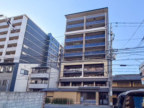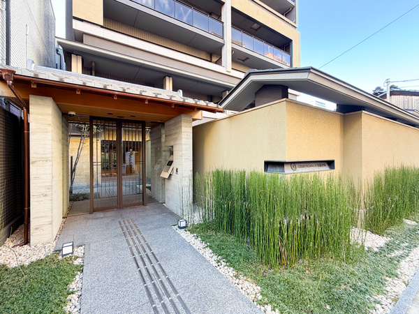 「グラン・リソシエ京都四条」は中京区藤本町に位置する、阪急京都線「烏丸」駅および京都市営地下鉄烏丸線「四条」駅まで徒歩7分のマンション。建物は「田の字地区」の景観に配慮した落ち着いた色調のタイル貼りとなっており、基壇部には御影石やボーダータイルなど、質感の異なる素材が採用されています。エントランスホールは石と光のコントラストによって、静寂な迎賓空間を演出するデザイン。セキュリティ面では、ハンズフリーで解錠可能な「Tebraキー」システムが採用されており、荷物が多い際の入館もスムーズです。また、留守中に荷物を受け取れる宅配ボックスや、防犯カメラも共用部に設置。共用廊下にはプライバシー性の高いホテルライクな内廊下設計が導入されています。専有部は、全邸が角住戸となるプランニング。周辺環境については、大型商業施設の「COCON KARASUMA」や「大丸京都店」が徒歩圏内にあるのが特徴です。さらに、深夜まで営業しているスーパーマーケット「ライフ四条烏丸店」も身近にあり、都心ならではの利便性が整っています。