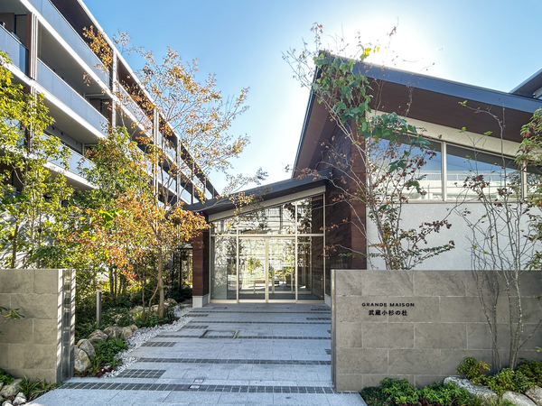 「グランドメゾン武蔵小杉の杜」は中原区今井西町に位置する、2025年6月竣工、総戸数271戸の大規模マンションです。約1万平米におよぶ広大な敷地には、既存樹を活かした豊かな植栽計画「四季彩の杜」が整備され、都心にありながら緑に包まれた住環境が創出されています。建物はアースカラーを基調とし、水平ラインを強調した邸宅感あふれる外観デザイン。敷地内には優雅な車寄せが設けられ、住まう方を迎え入れる格式高いアプローチが配されました。共用部には、二層吹抜けの開放的なラウンジや、テレワークや学習に利用できるワークラウンジなどが用意され、大規模物件ならではの充実した施設が採用されています。また、プライバシーを高める内廊下設計や、セキュリティと利便性を両立する顔認証システムも導入され、安心で快適な暮らしを支える設備が備えられています。専有部においては、環境に配慮したZEH-M Orientedの認定を取得し、断熱性や省エネ性能に優れた住空間となります。周辺環境については、「武蔵小杉東急スクエア」や「グランツリー武蔵小杉」などの大型商業施設に加え、広大な「中原平和公園」も徒歩圏内です。