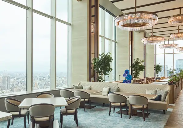 ダイニングフロアは最上階の36階と35階の一部を吹抜けとした、開放感のある空間。360度の眺望とともに帝国ホテルによる食事を予約不要で楽しめる。