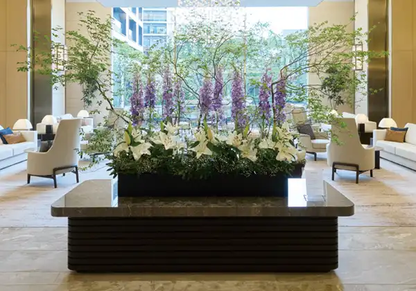 生花が飾られた華やかなエントランス。コンシェルジュが入居者の日々の暮らしをサポートする。