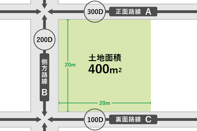 たとえば、以下の3つの路線に接する400㎡の、普通商業・併用住宅地区にある土地では以下のように計算できるでしょう。