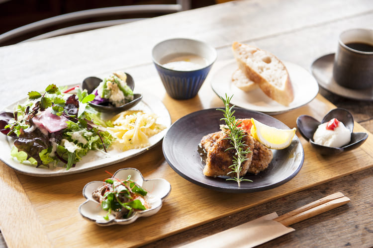 五感で寺家の自然やアートを楽しんでもらいたいという坂上さんの思いは、カフェの料理にも表れていて、ランチにはスタッフたちが近くの畑で育てた無農薬野菜をできるだけ使うようにしているそうです。旬の野菜たっぷりのランチを、自然を眺めながらいただいていると、まるでどこか遠くに旅したかのような気分になってきます。