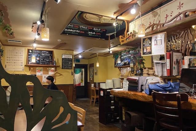 商店街を散歩してお腹が空いたので、ランチを食べることに。商店街の近くにある「ビストロバル だんだん 川口店」というお店にやってきました。地下へと続く階段を下りると、隠れ家感のあるウッディな空間が広がっています。
