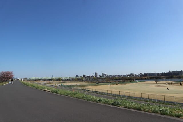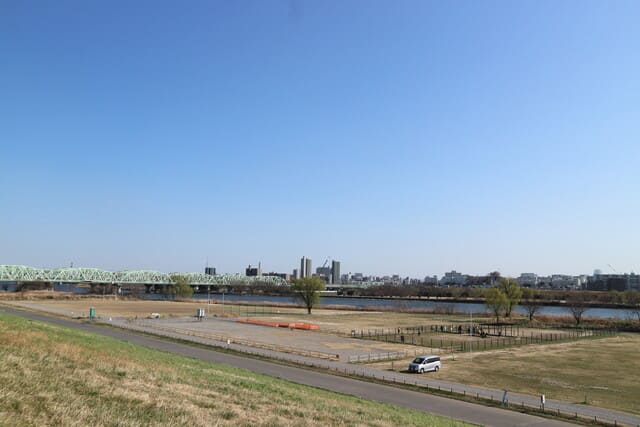 お腹をしっかりと満たしたあとは、今度は駅の西口からしばらく歩き、「荒川」の土手にやってきました。広々とした川沿いのスペースにはドッグランや運動公園があり、地域住民の憩いの場所になっているようでした。