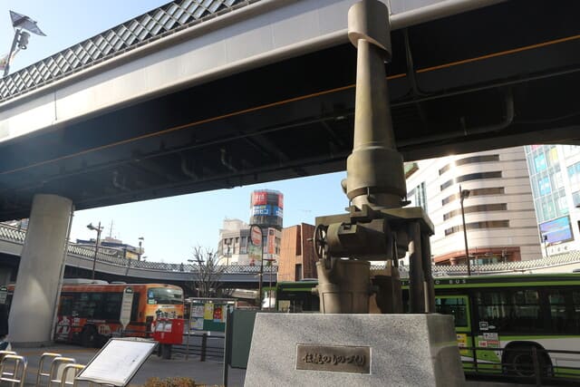 ▲駅前には“ものづくりの街”のシンボルとして、「キュポラ」像が立っている