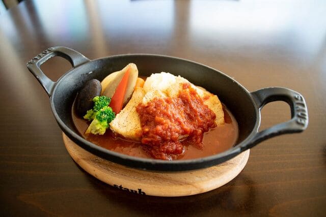 お店の自慢は、自社産野菜を使用したストウブ料理。この日は「カジキマグロのトマトソース煮」(900円)を注文しました。肉厚でジューシーなカジキマグロに、味わい深いトマトソースがよく絡み、付け合わせの野菜もホクホク。満足感たっぷりの一皿でした!