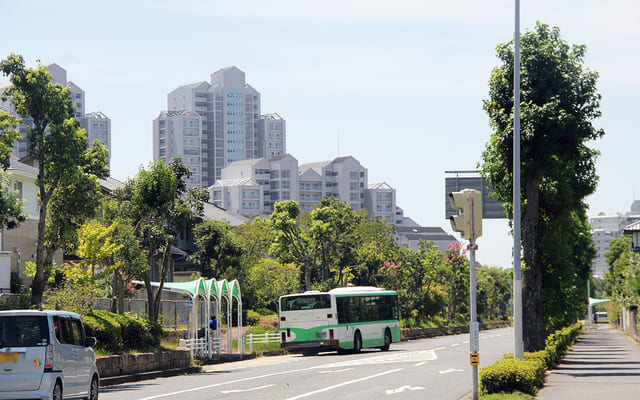 さらに駅前エリアからバスで少し移動すると、あたりは戸建ての多い住宅街に。少し駅から離れた立地で住まいを探しても、車道も広く、緑も多いので快適な車移動生活が送れそうです。