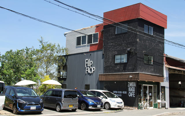 住宅街を抜け、まだ田んぼの風景が残る西区平野町エリアにまでやってきました。”眺めの良い店”として地元で知られるカフェレストラン「FLIP FLOP」でランチをすることに。
