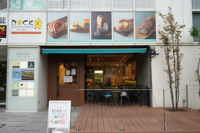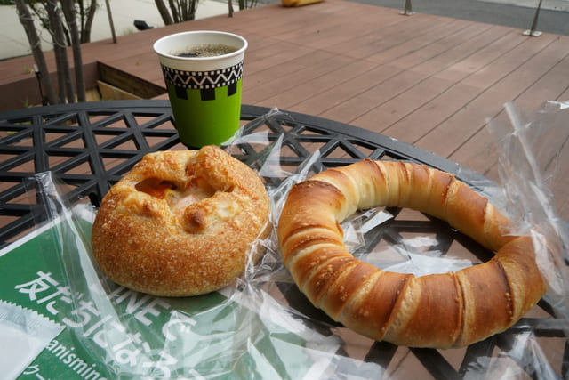 朝ごはん用のおすすめを聞いて「全粒粉トマトチーズ」(250円)と「クレセント塩」(130円)を店頭にあるデッキテラスでいただきました。パンはどちらももっちり感と歯切れのよさがあります。300円以上の購入でコーヒー1杯プレゼントというお得なサービスも。