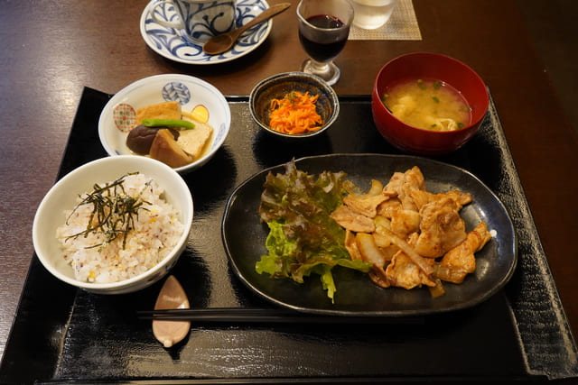 2種類から選べるお得な「波音セット」から、生姜焼きがメインの「波(税込1,400円)」をいただきました。メインに加えて、2つの小鉢、雑穀米、お味噌汁、食前のカシスブドウ酢、食後にはコーヒーとプチデザートまでついている充実のセットメニューです。ドレッシングや生姜焼きのタレも手作りなのも自慢。おいしくて体にやさしい味にお腹も心も満足する食事どころの存在は心強いものです。