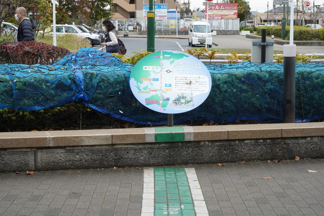▲新鎌ヶ谷駅前には東経140度線が通っています