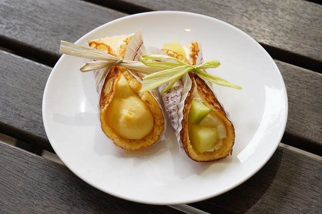 シェフのおすすめは「おいし湘南です(200円)」というユニークな名前のふんわり焼き上げたクレープ生地のお菓子。定番のカスタード入りと、季節ごとのフルーツ入りがあります。誕生日などにオーダーできる似顔絵ケーキも好評です。