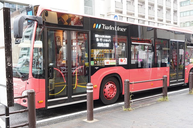 慶應大学のキャンパスと駅の間を結ぶ2連結の長いバスが、近所の子どもたちにも人気です。