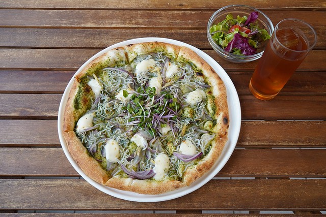 店の名前が付いた「湘南テラスピザ(1,420円)」をいただきました。迫力の大きさのピザには、湘南名物しらすが本当にたっぷり。窯焼きのピザは香ばしく、大葉を使ったジェノベーゼソースに加えて、少し生姜も効いていてさっぱり。ランチタイムはサラダと飲み物もついています。