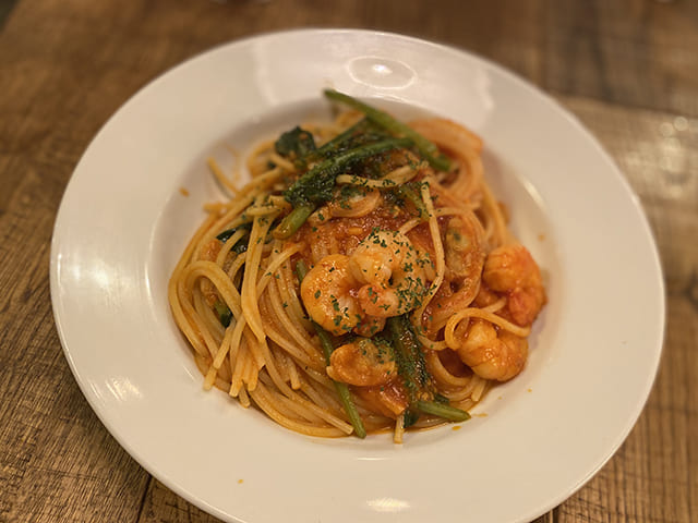 ランチは「本日のAパスタ」(790円)を注文してみました。この日は海老やアサリを使ったトマトソースパスタ。トマトの酸味と魚介の旨味が絶妙に絡んでいました!
