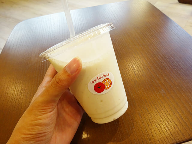 お腹が満たされた後は、近くのカフェ「Farm Stand HAND TO HAND」で少し休憩。新鮮な野菜や果物を使ったスムージーが多く揃うお店で、おすすめのバナナスムージー(378円)をいただきました。