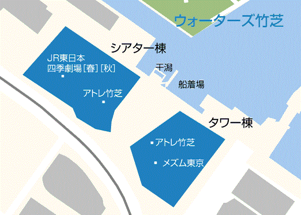 2020年8月にアトレ竹芝がグランドオープンした話題の新スポット「ウォーターズ竹芝」。ラグジュアリーホテル・オフィス・商業施設・劇場が揃う複合施設として、新たな賑わいが生まれます。建物は「タワー棟」と「シアター棟」に分かれていて、両棟に商業施設「アトレ竹芝」が。タワー棟にはホテル「メズム東京」、シアター棟には「JR東日本四季劇場[春][秋]」がオープンします。