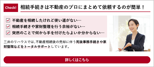 三井のリハウス シニアデザインでは死後の事務手続きから、家財整理、相続税申告サポート、売却まで相続にまつわる多くの手続きをサポートいたします。ヒアリングを行い、お客さまに合ったサポートをご提案いたしますので、ぜひお気軽にご相談ください。